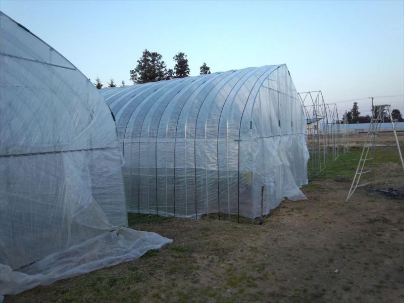 15日から苗箱に種をまく予定なので、できるだけ建てておきたいところです。しかしながら風が強いとシートが風にあおられうまくいかないので、風がないところを狙って建てます。今日はなんとか2棟目を建てれました。