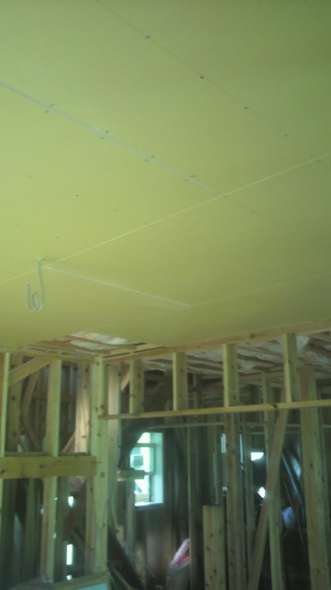 断熱材が敷き詰められた天井を石膏ボードで隠します。