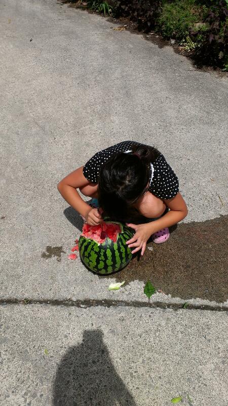 一人で割れたスイカを食べて