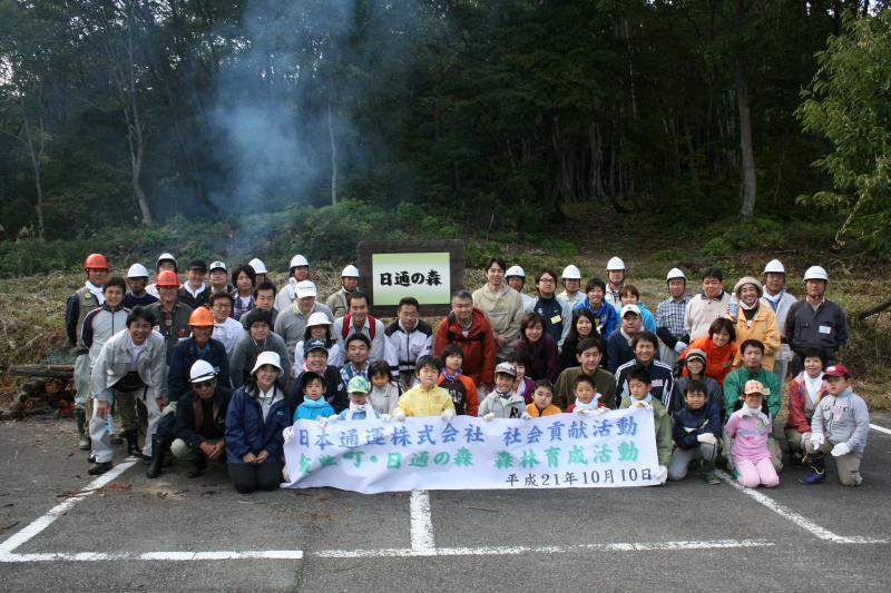 日通の森、森林育成活動秋ツアーが10月10日に行われました。参加者40名が5班に分かれ、1,000uに400本のブナの植林を行いました。