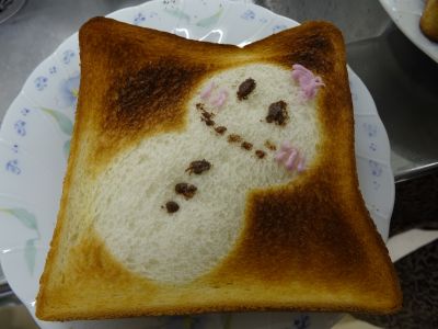 食パンの焼ける部分と白く残る部分を考えながら、最後にチョコレートペンで仕上げ、楽しい絵柄のトーストアートが出来上がりました。