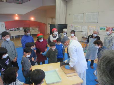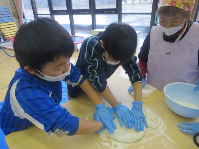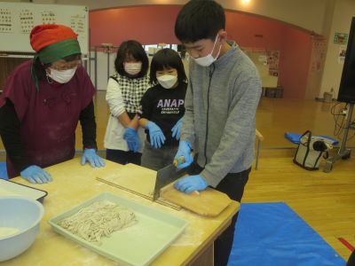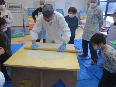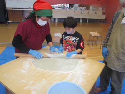 12月3日(水)手ノ子小学校の放課後活動でそば打ち体験をしました。「高峰そば工房」の井上さんのそば打ち実演を見学の後、ふるさと学園の皆さんと一緒にそば打ちを体験してもらいました。