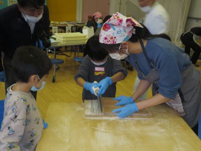 子どもたちにはそばを薄く伸ばすところから体験してもらいました。
