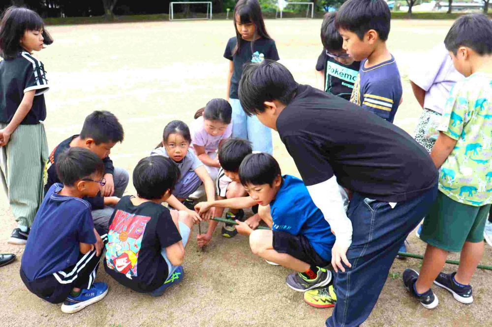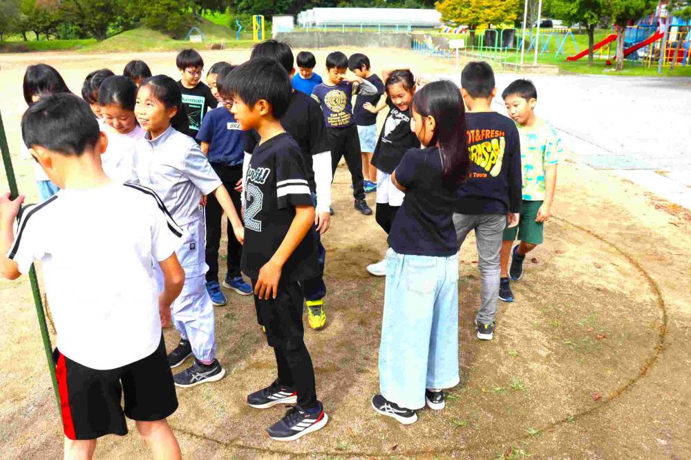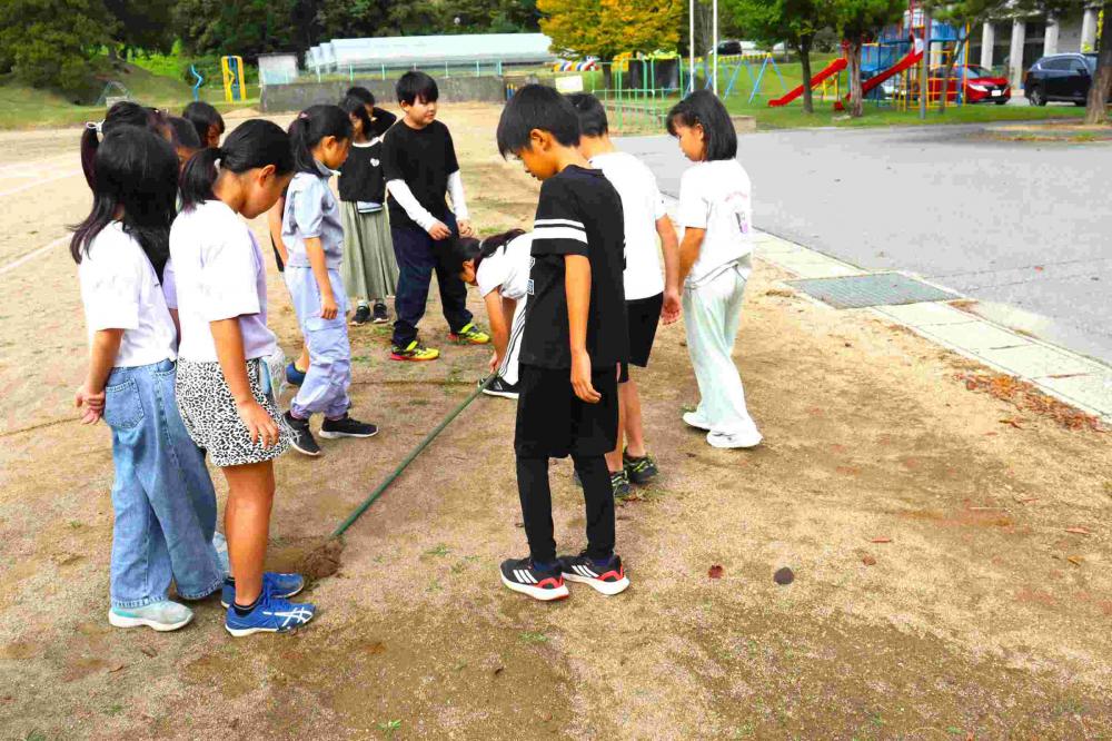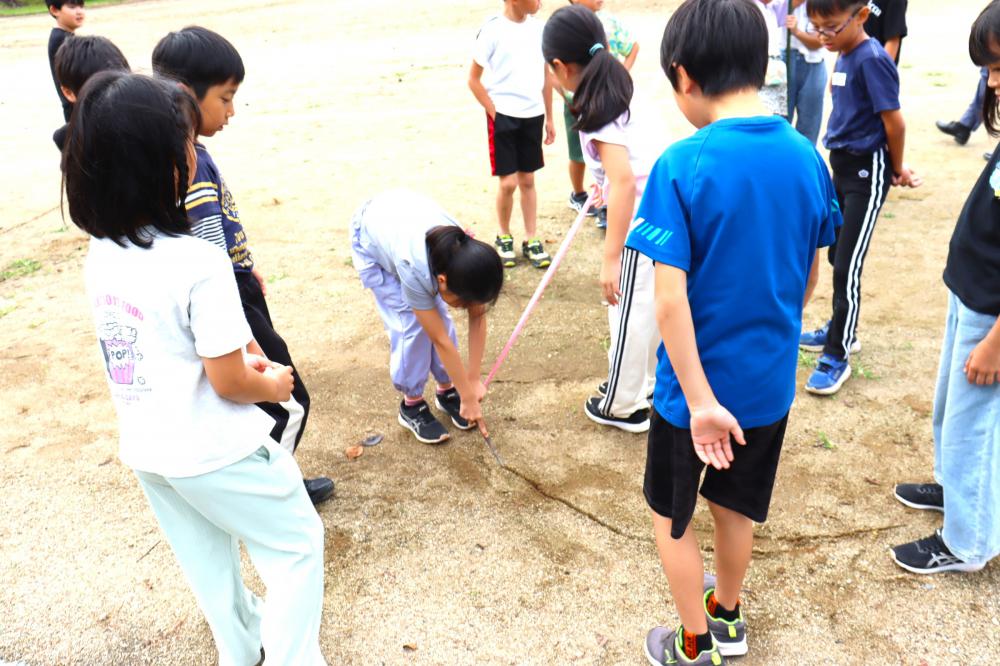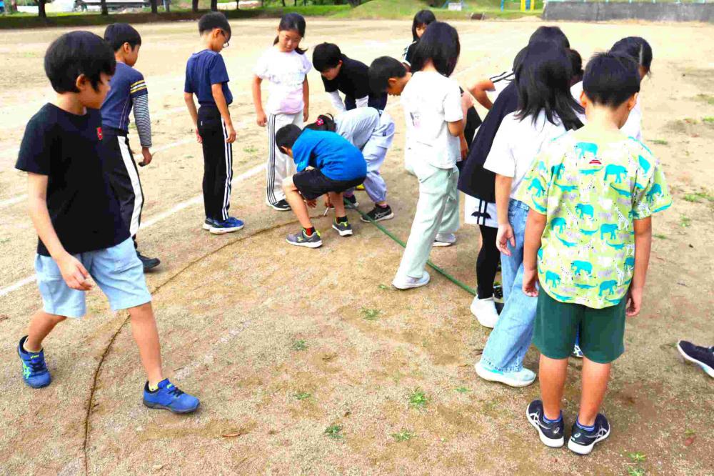 3年生が、算数の学習でグラウンドに出ていました。円の学習の1時間めです。