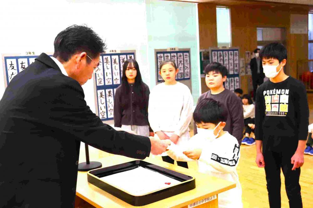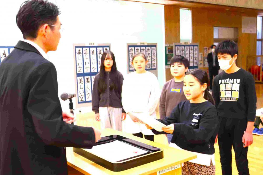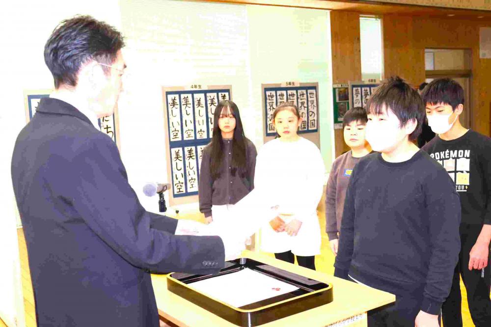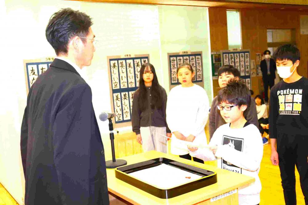 全校朝会で、2~6年生の3学期学級委員を任命しました。