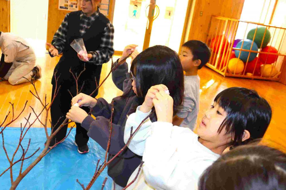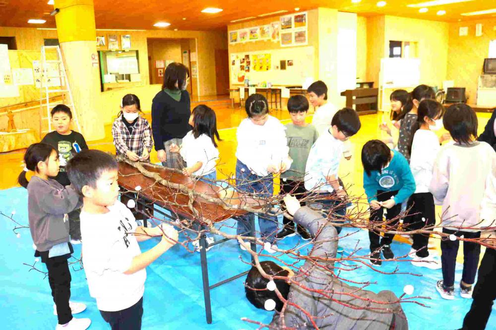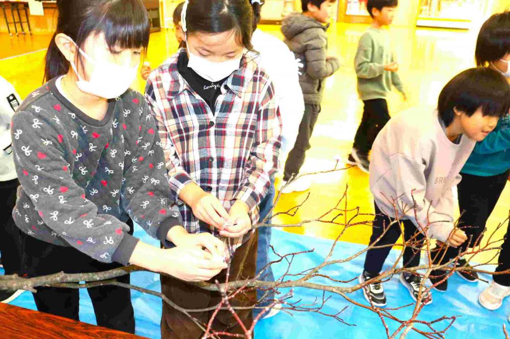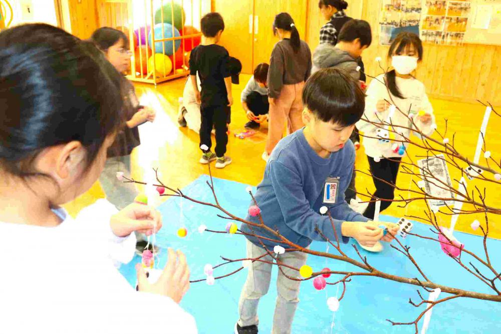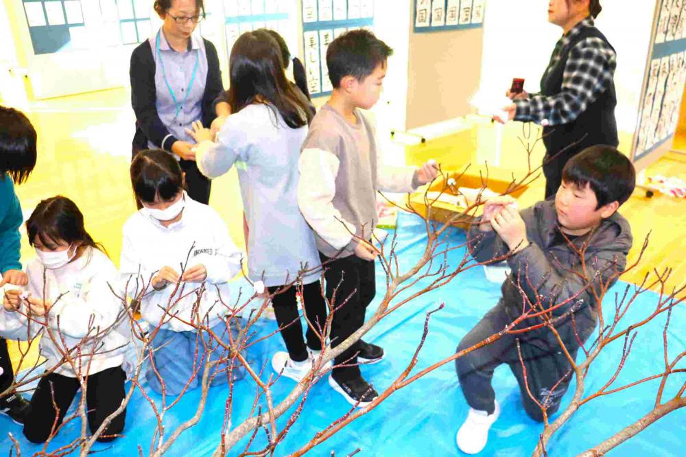 第二小学校では伝統の活動です。だんごの木も、昨年のうちから見事なものを準備していただきました。