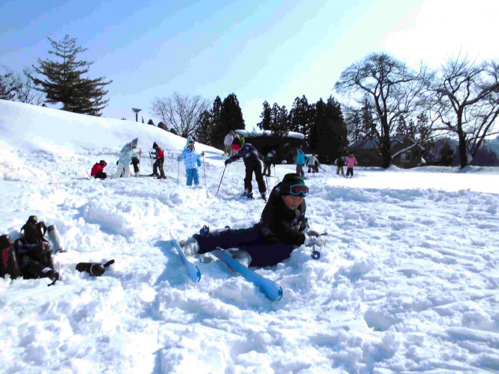 15日、1・2年生がグラウンドでスキー授業を行いました。