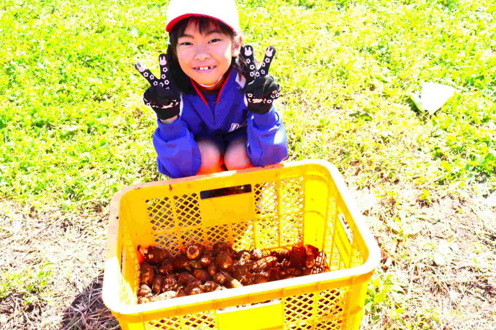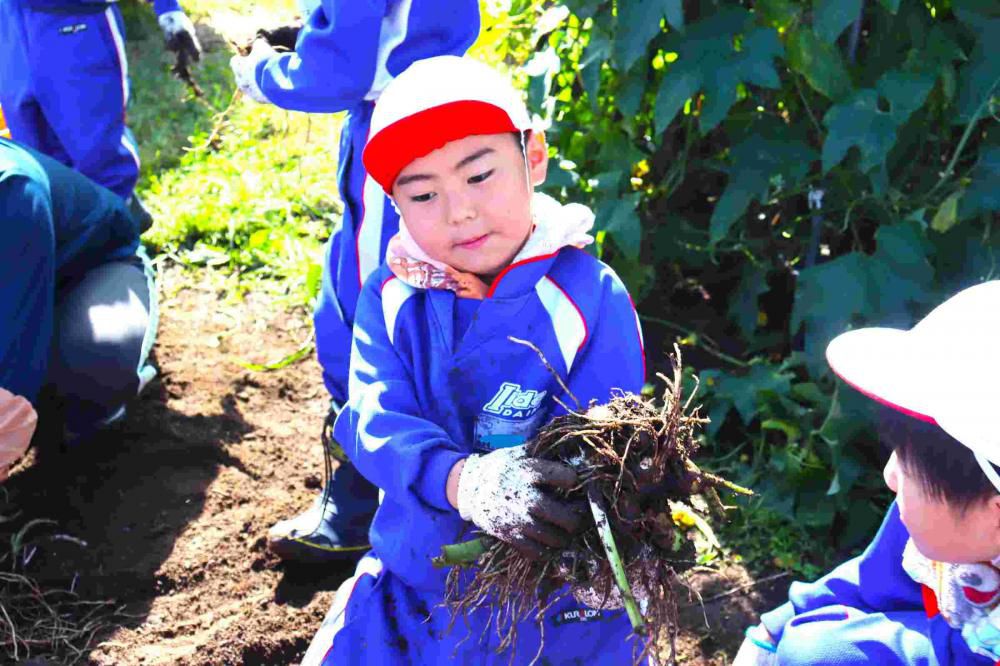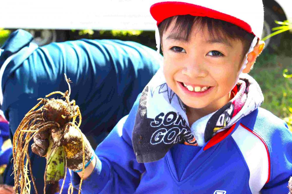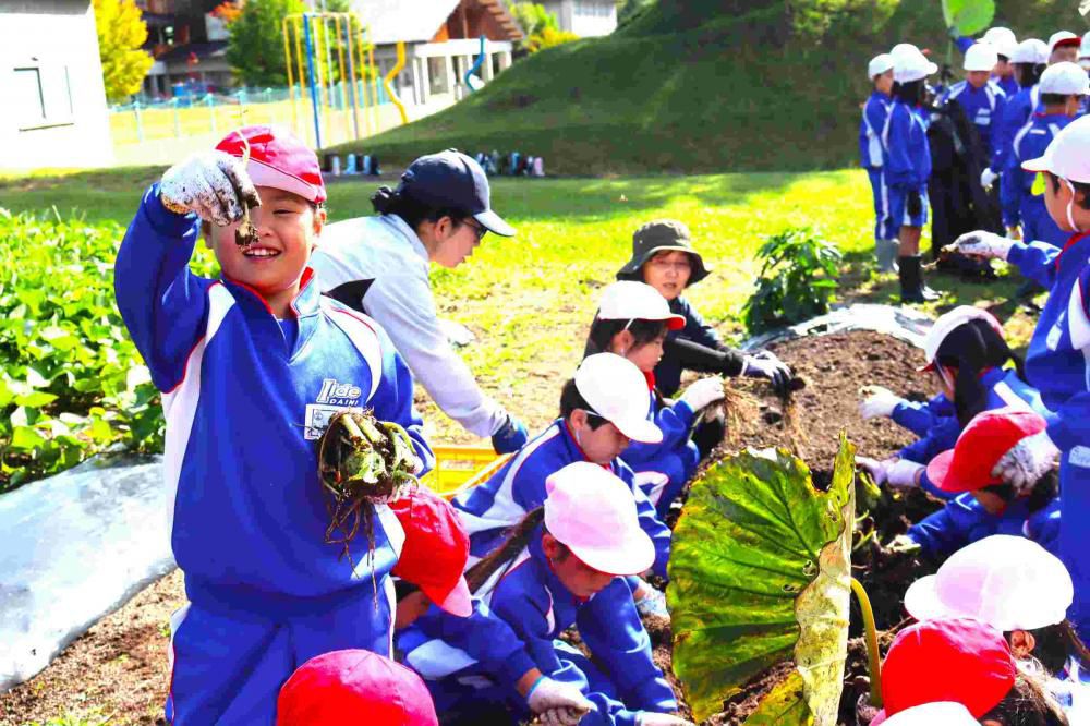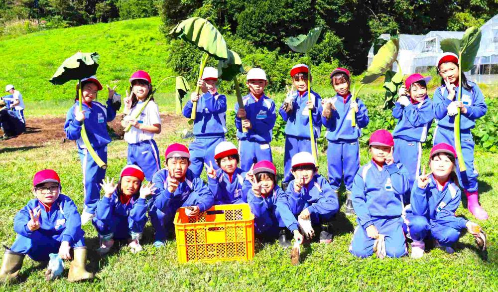 1~3年生が、畑で育ててきた里芋を掘りました。昨日があいにくの雨のため、本日に行いました。