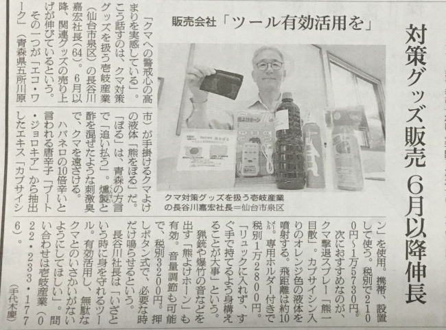 「クマへの警戒心の高まりを実感している」。こう話すのは、クマ対策グッズを扱う壱岐産業(仙台市泉区)の長谷川嘉宏社長(64)。6月以降、関連グッズの売り上げが伸びているという。