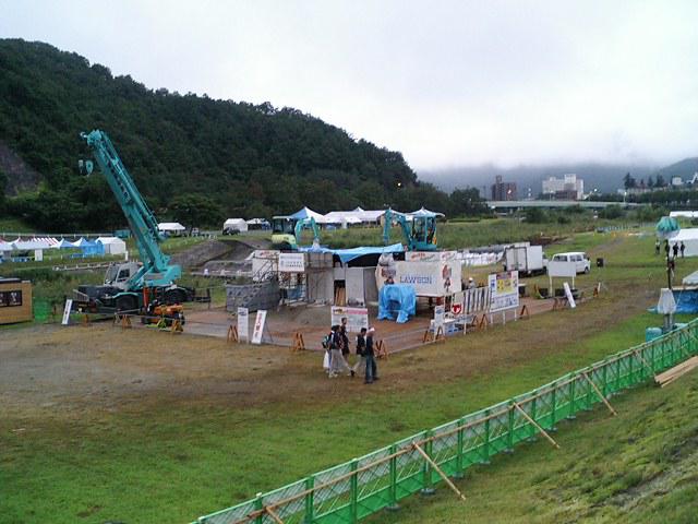 曇り、画面中央に大鍋がしつらえられている。上には雨よけのブルーシート。
