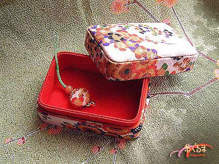 ピンク地に梅の花の模様の錦紗縮緬の小箱。サイズは11.5センチ×8センチ×5.5センチ(H)