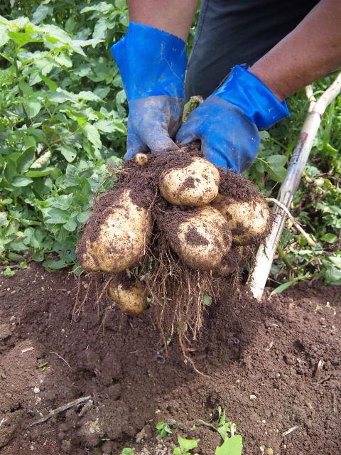 ゴム手袋で土の中に残った芋を探し出します。無農薬なので、自然育成のジャガイモです。大きいでしょう?