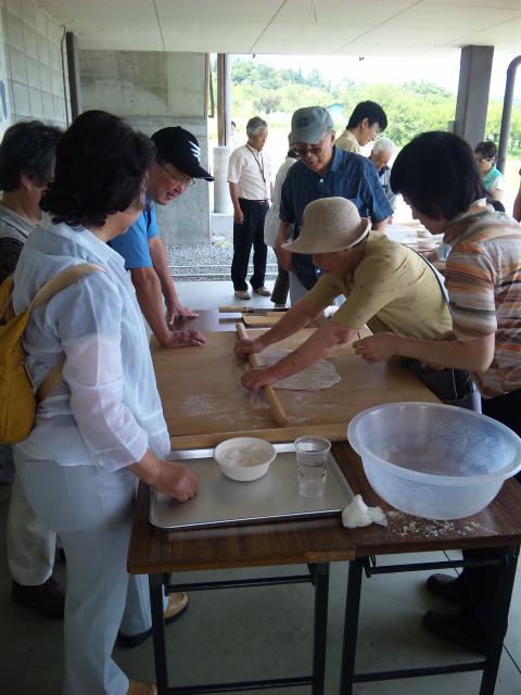 仙台泉パークタウンからの、バスツアーの皆さんが古代の丘体験交流センターで蕎麦打ちを体験しました。泉区のスーパーマーケット・キャラウエイで長井市地場産センターが物産販売を行っており、今日は常日頃ご利用いただいている方々がお越しになりました。新野副市長さんも、蕎麦打ち師匠として参加されて、大好評でした。この体験交流センターの近くの畑では、昨年より採れたて野菜をキャラウエイで販売しており、大人気です。