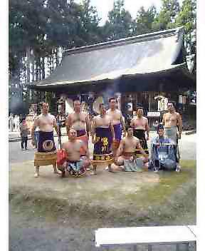 お祭りの獅子の警護をする方々です。昔は相撲取りをして選んだそうで、名残りで土俵入りをしています。