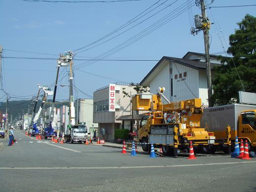 東北電力に連絡してからあっという間に高所作業車がご覧のように集まって