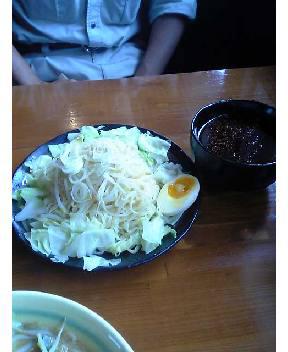 つけ麺です。まわりに茹でたキャベツがあり野菜不足になりません。タレが和風ベースに辛みがあり、和・中混在と言ったところ。