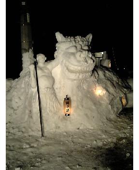 お手伝いして4時間掛かった力作の獅子の雪像です。黒獅子ですが白獅子です。賽銭箱を置くのを忘れました。残念!