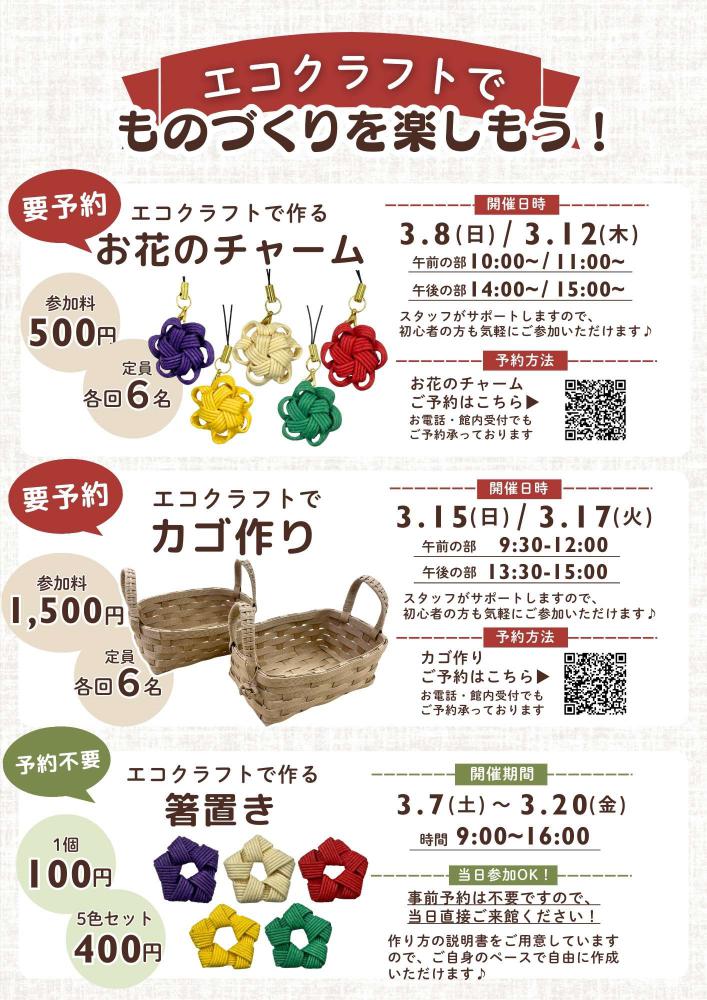 A. チャーム作りとカゴ作りは事前予約が必要です。本ページに記載の予約受付フォームまたはお電話・館内受付にて承っております。