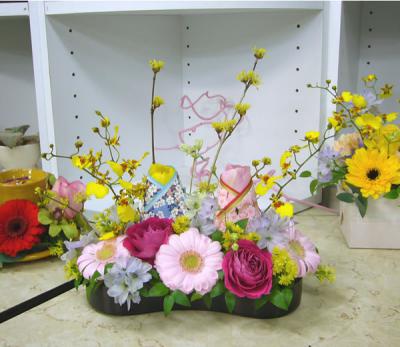 本日はお子様向けのイベントがありました。歌のコンサートもあるのでそちらの会場にコンサートのお祝い用のお花をお届けいたしました。歌う方は素敵な男性と女性ですが、あくまでもお子様に喜んでいただけることをコンセプトにちょっと遊んでみました。でもみんな気づいてくれたかなー