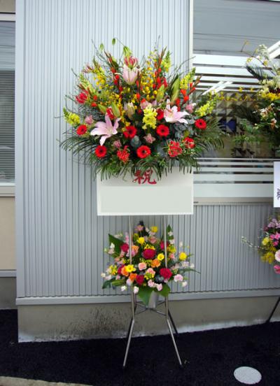 本日お届けのお祝いスタンドフラワーです。かわいいバラがいろいろ入ったので下の段にいろいろ入れてみました。今回はグラジオラスがとてもきれいなものが入荷したのでグラジオラスを生けてみました。ちょっと地面が傾斜しているのでなんとなく写真が斜めです。しかし今回入荷のピンクのユリはすごく花がおおきいなー。