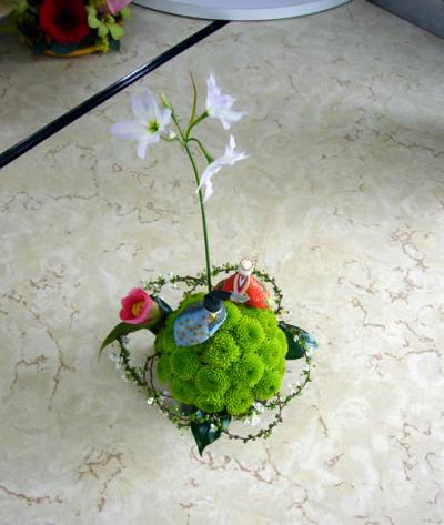 グリーンのミニピンポン菊で山を作ってお雛様を飾ってみました。お雛様も手作り。紙粘土と和紙で作りました。細かい作業なのだー。シックなお雛様は和菓子をイメージして作りました。和菓子ってシンプルなのにそれらしく見えるのですごいなーっていつも感心していたのでちょっとまねしてみたつもり。シンプルで落ち着いた大人のお雛様です。