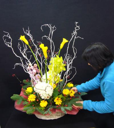 今回の鉢物市でジゴペタラムを入荷いたしました。3150円です。なかなかきれいですよ。今は贈答品の季節ではないのでお買い得価格となっております。一緒に店内に並んでいるアレンジも撮影いたしました。