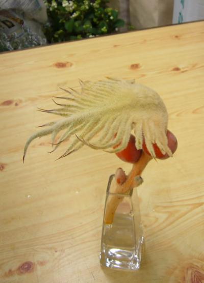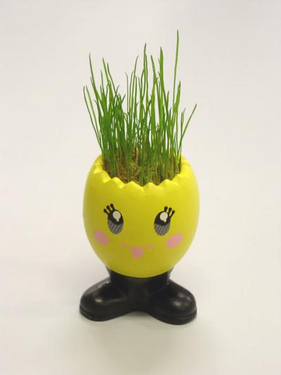 ひとつ見本に袋から出したものをお店に飾っています。テラコッタの卵の中に芝のような草の種が入っています。伸びたら好きな髪形にカット。こういう簡単に育てられるものっていいですねー。プレゼントにいかがですか。