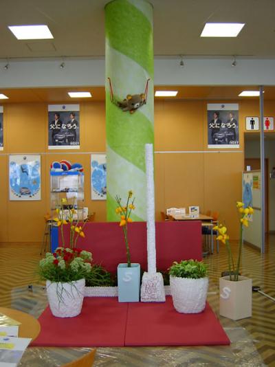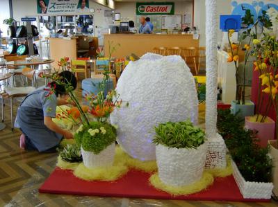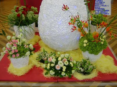 完成品です。ピンクの柱には鞠麩を貼って模様を書いてみました。りんごもぶら下げて、東根名物ディスプレーなんちゃって。バラの花を入れてといわれたのですが、日持ちをかんがえて(10日間ありまーす)ユーカリローズにしました。