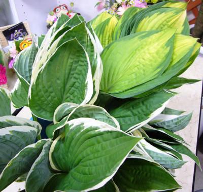 本日はギボウシの葉が3種類入荷しました。こちらは黄緑色のギボウシの葉とちょっと濃い目のグリーンに白い縁取りが入ったギボウシの写真です。アレンジに入れるとおしゃれな雰囲気に見える色ですよ。この暑い季節でもギボウシの葉は日持ちがよいので、生けこみの花材としてとても重宝します。ちなみに私は食べ物としてもギンボが大好きです。
