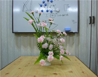 50cm×50cmのテーブルに置くお花とのご注文でした。会議場の真ん中に飾るのだそうです。(ロの字に並べたテーブルの中央部分)いがぐりみたいなのはナデシコです。本日はきれいなピンクのトルコキキョウと白いカラーがとても品物がよいのでこれらをメインに作りました。