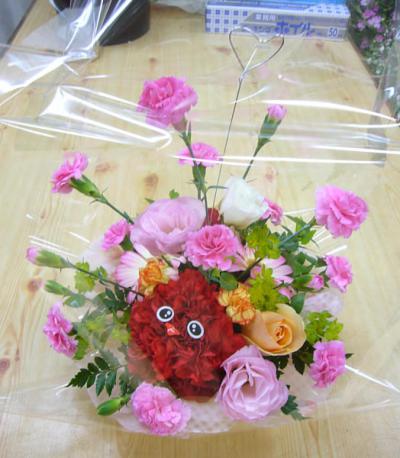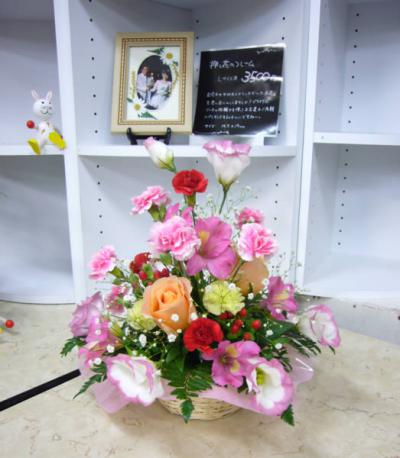 こちらのアレンジは3500円です。今日は大きなバラが入荷したのでポイントに使ってみました。ちょっと早めにお母さんにプレゼントするのだそうです。お花の入荷は毎週月、水、金曜日。今日もいろいろなカーネーションが入荷しました。