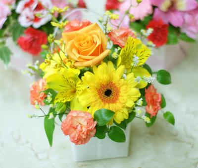 かわいらしいサイズのアレンジメントです。写真は黄色のお花を指していますね〜。そのほか店頭にピンク系のお花を挿したアレンジメントなどいろいろ飾っています。ぜひ見に来てねー。 |