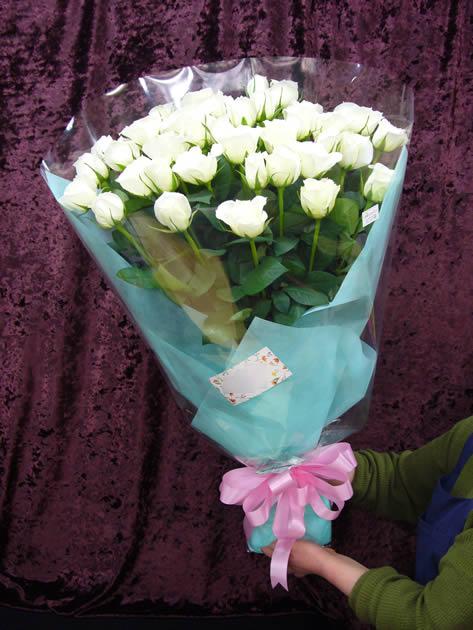 お誕生日のプレゼントに37本のバラの花束です。今回入荷の白バラは長くてとても立派です。ちょっと手しかうつっていないので大きさがわかりませんねー。
