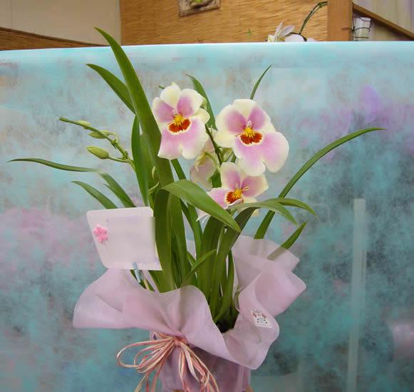 こちらはお届けいたしましたミルトニアです。かわいいピンクですね。今日は写真撮影場所がなくて片手にお花片手に背景を持って撮影。下5センチぐらい写ってませんでした。すみません。