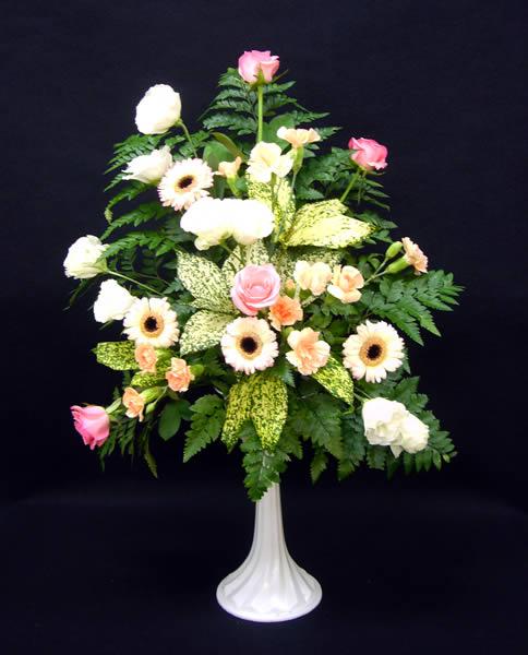 このサイズではちょっとピンとこないかもしれませんが、大きなアレンジメントを作るときは効果的な技法です。花屋さんの仕事で言うと、開店祝いの花や1万円ぐらいのアレンジメントなど。