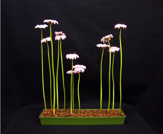 本日の教室はパラレルの基礎科です。12本のガーベラを使って練習します。初めは器が大きくかんじられますが、生けてみるとむしろ小さくかんじます。時々遠くから見てバランスを整えましょう。