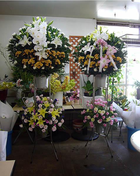 左が31500円、右が21000円の弔花(お供え・お悔やみ)スタンドフラワーです。31500円のお花のご注文はあまりないなので、大きさ比較のため21000円のお花と並べて写真を撮ってみましたー。写真で見るとあまり大きさの違いがわかりませんねー。たくさんお花がならんだ会場で見たほうが、大きさがよくわかるかも。