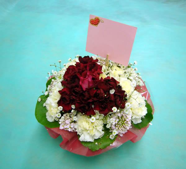 お誕生日のお祝い用にハートのアレンジメントのリクエストがありました。「赤いハートで周りを白い花で。」ということで、本日ハートが作れそうな小さい花は、赤と白のスプレーカーネーション。