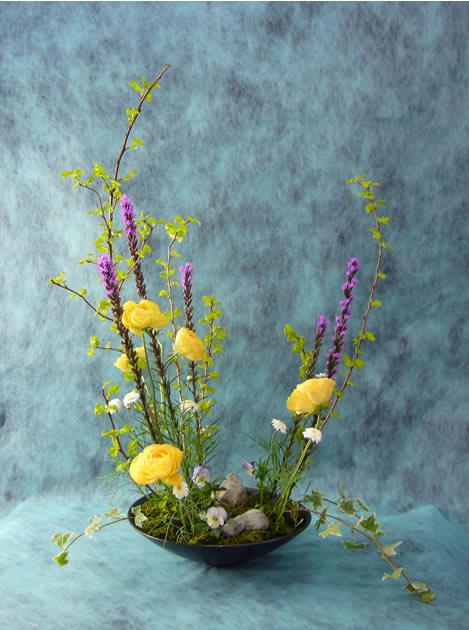 本日の教室はヴェゲタティーフ。かわいいラナンキュラスとマーガレット、金葉コデマリ、リアトリスをいけてみました。仕上げに足元にプランターのビオラをスミレのつもりでプラス。とてもやさしい雰囲気になりました。