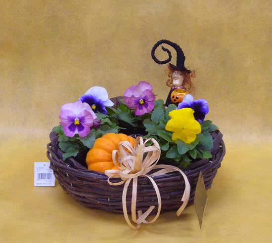 秋の贈り物に。パンジーを5つ、とっても素敵なリースカゴに寄せてみました。ドーナツ型をしています。ハロウィンのお人形と生のかぼちゃを添えてみました。こちらは2500円です。パンジーはこれからの季節、夏物の苗との植え替えにぴったりですね。