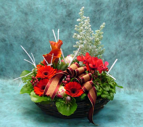 クリスマスプレゼント用に作ってみました!こちらのアレンジメントは5250円です。リース型のバスケットにシクラメンの鉢植を入れて後はお花をアレンジしています。クリスマスごろになるとまた花材もいろいろ入りますので、お花は当店にお任せでお願いします。写真は真っ赤なガーベラとオレンジのカラーを使用いたしました。市場が月、水、金曜日ですので、色のご指定がありましたらお早めにご注文下さいね。白系、黄色系、ピンク系などなど。