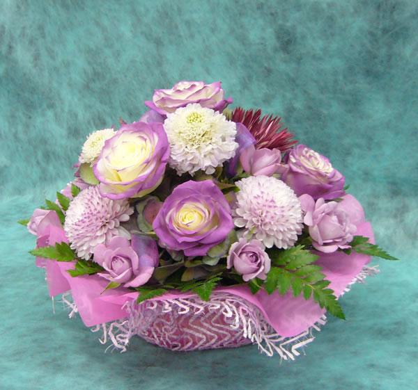 パープル系のお花で作ったアレンジメントです。香りのよいバラと最近たびたび入荷する色が変わるばら、ピンポンマム、ガーベラで作りました。何種類ものパープル系のお花が入荷するときがあまりないので、ご注文の際は電話にてお問い合わせ下さい。