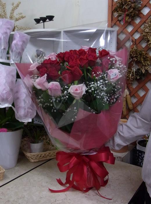 ピンクのバラを外側に、内側は赤バラでまとめて花束に。