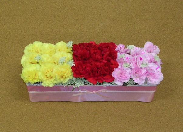 母の日に手作りアレンジメントはいかがでしょう。お店で売っているようなアレンジメントだとなかなか基礎が分からないとうまくまとまりませんが、このように一列に並べるだけでもなかなか可愛いアレンジメントに仕上がりますよー。