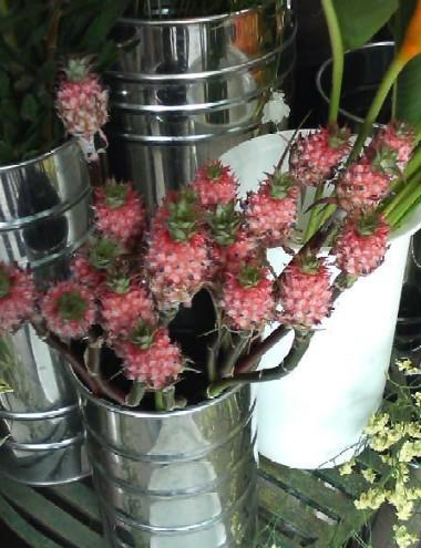 ミニパインの切花が入荷しました。このぐらいの大きさだとアレンジに使いやすいなー。色も赤みがかっていてきれいです。ちなみに熟してくるととてもおいしそうなパイナップルのにおいがします。が、実の部分はほとんど無くて、渋いそうです。実際に食べてみたお客さんにききました。チャレンジャーだ。