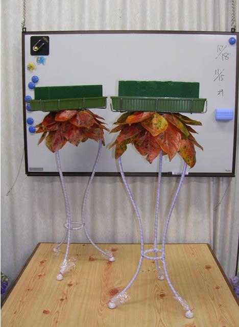 食卓の花の土台部分です。柿の葉をつけてみました。