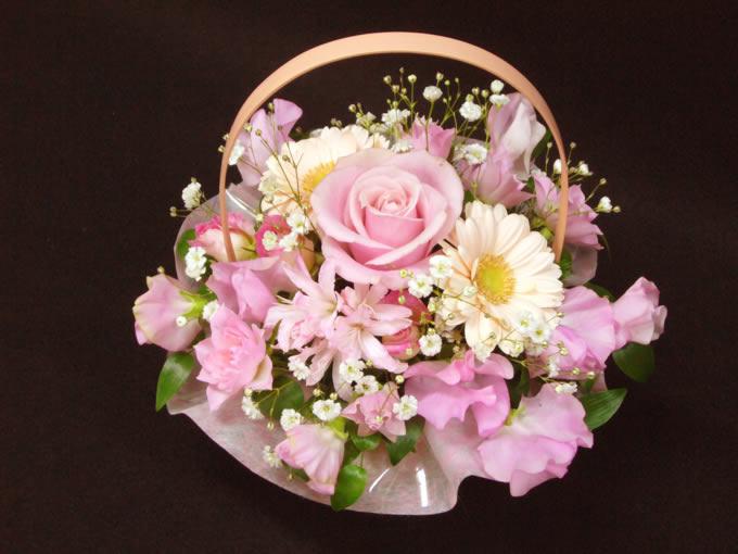 ご注文は淡いピンク、黄緑又はホワイト系、淡い黄色の三種類。取っ手がついている籠とのご指定です。こちらの写真淡いピンクです。