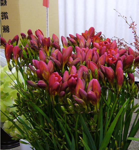 こちらは赤いフリージアです。お花が大きくてこれも立派な品物です。ただし枝が少々曲がってます。