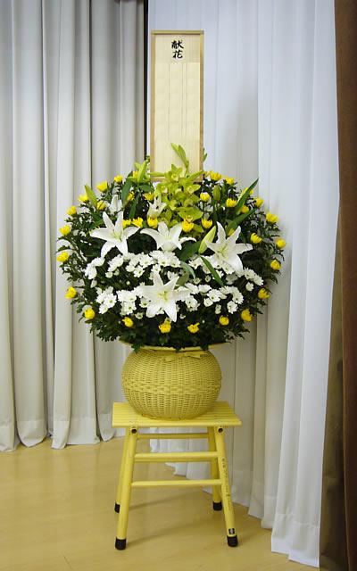 だるまカゴも15000円より受付です。こちらは立派なカゴ(だるまカゴ)につくります。お花は1段ですが、2段の物より背が低いので2段の弔花と組み合わせて飾ると見栄えがいいです。写真はセレモニーホールにお届けしたものです。
