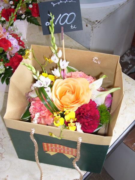 こちらはお花用の紙袋に入ったアレンジメントです。写真はシックな色のトルコキキョウ(アンバーブラウン)が入っています。写真には写ってませんが涼しげなガラスの器に入ってます。